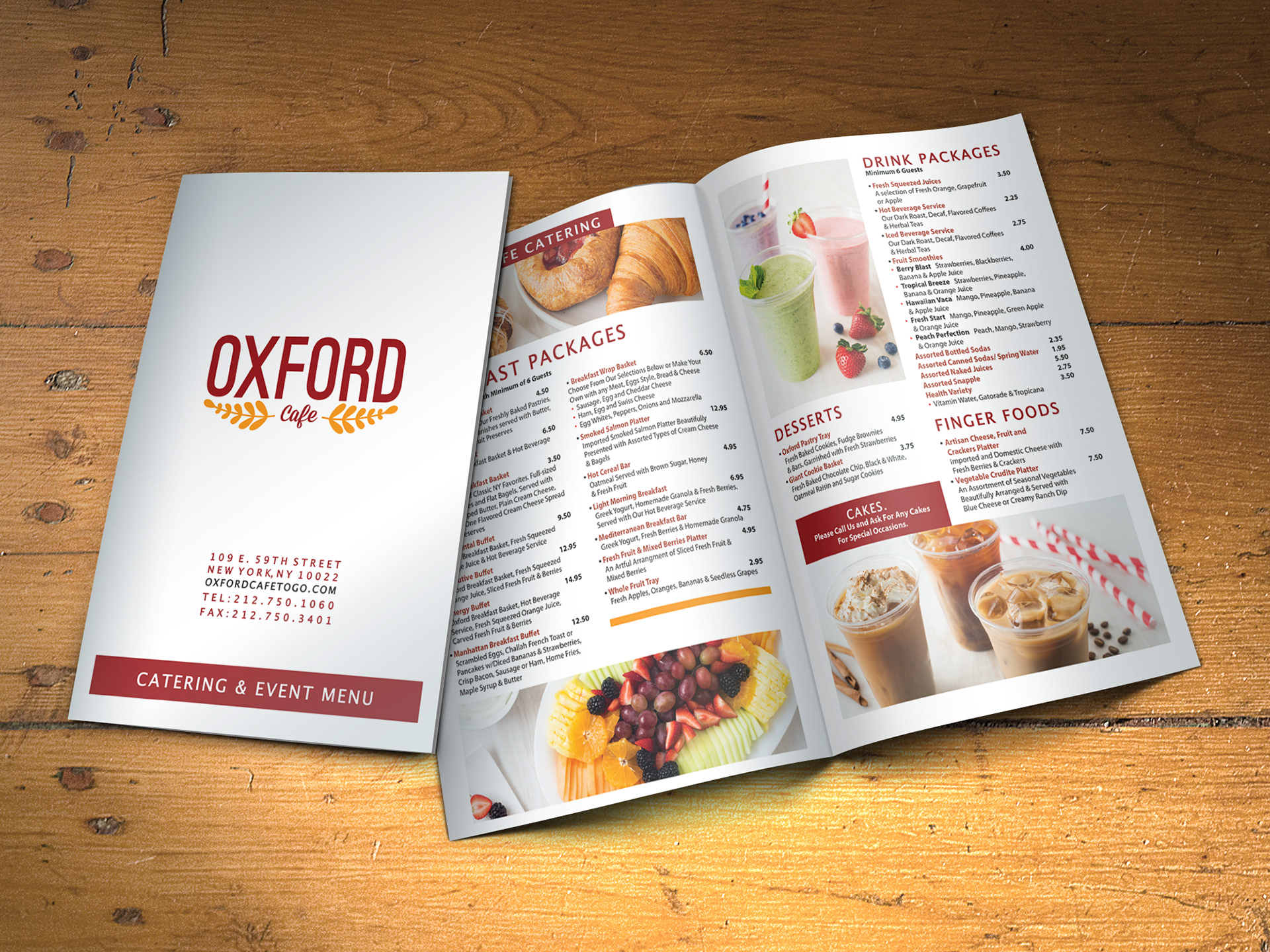 I redesigned the Catering Menu for one of the NYC locations of Oxford Cafe on 59th Street. Client supplied custom photography. I chose and set type and layouts.